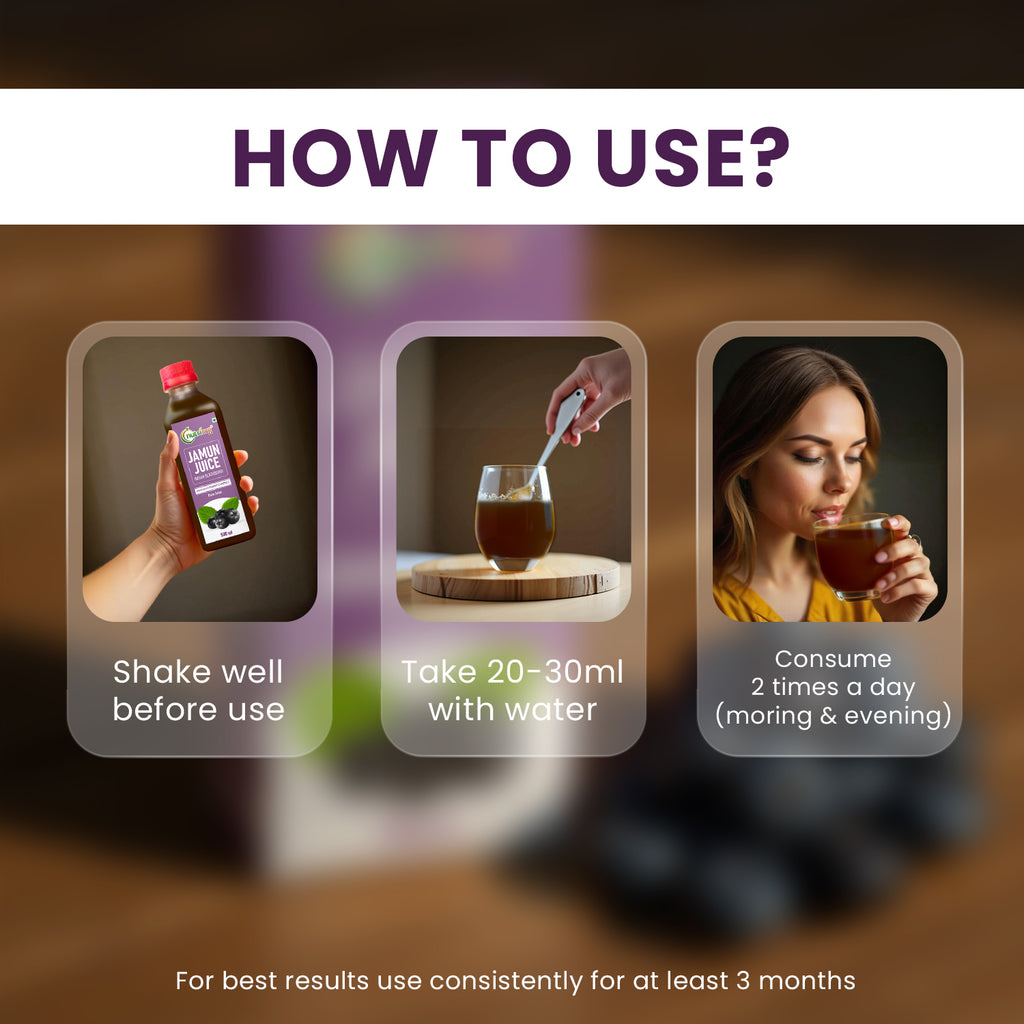 Evening- (empty stomach) 20-30 ml Jamun Juice with one glass of lukewarm water