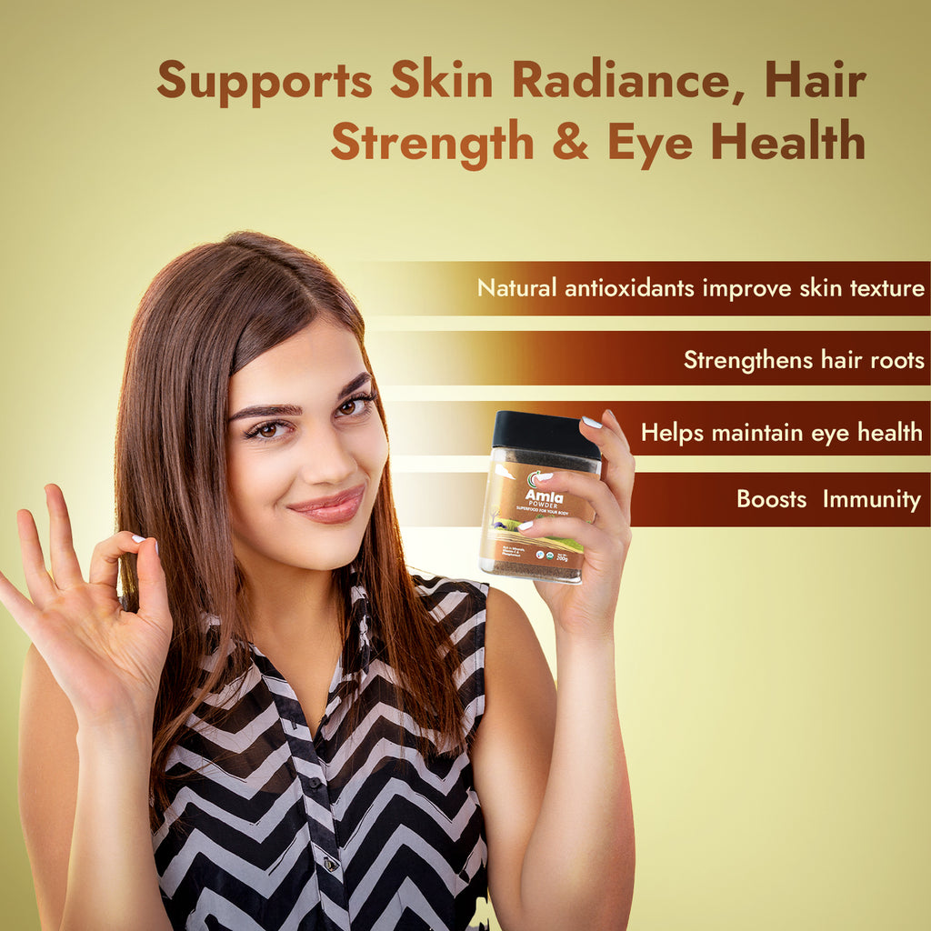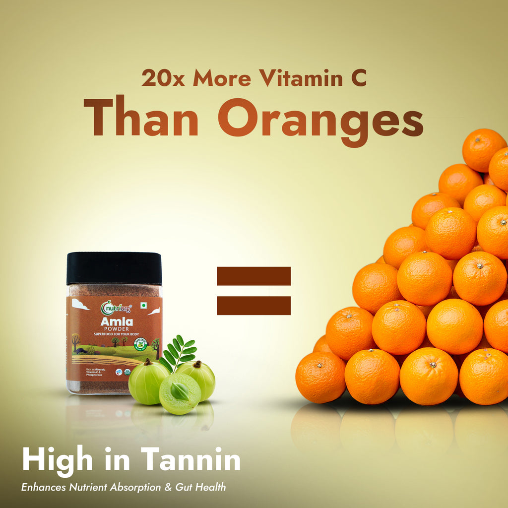 - The Amla Powder is a rich source of Vitamin C, it is considered to contain 20 times more vitamin C than oranges.