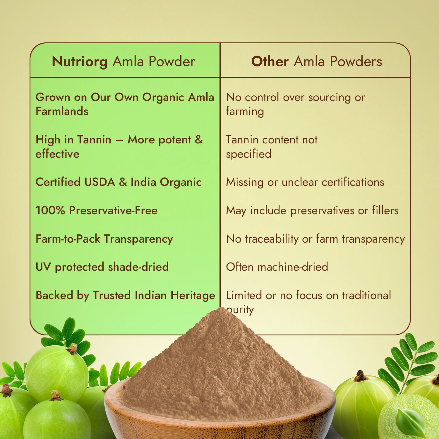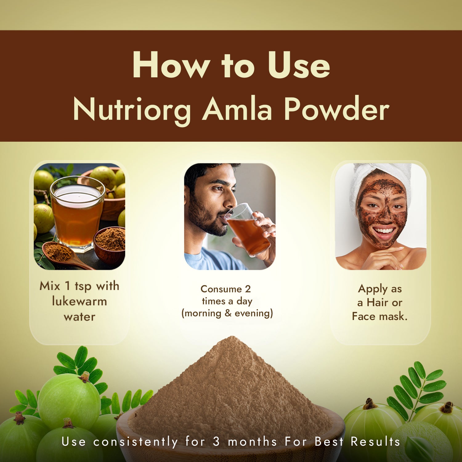 - Nutriorg Amla Powder is useful for promoting longevity, improving digestion, strengthening & stimulating the hair growth.