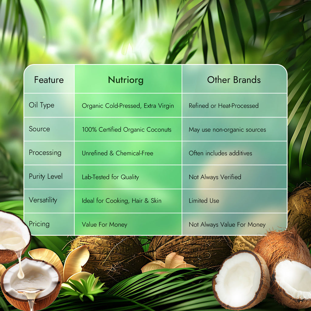 Nutriorg Certified Organic Extra Virgin Coconut oil is one of the most beneficial oils known to mankind and is multi-purpose oil used for cooking, application on skin and hair, aiding weight loss, treating infections, improving digestion and building the body’s immune system. Extra Virgin Coconut oil has earned popularity across the world for its wondrous healing effects. Nutriorg brings to you a premium quality certified organic extra virgin coconut oil which is hygienically extracted from organically grown and cultivated coconuts. It has added advantage for your health since it is multi faceted oil and is organically grown, pure and raw.