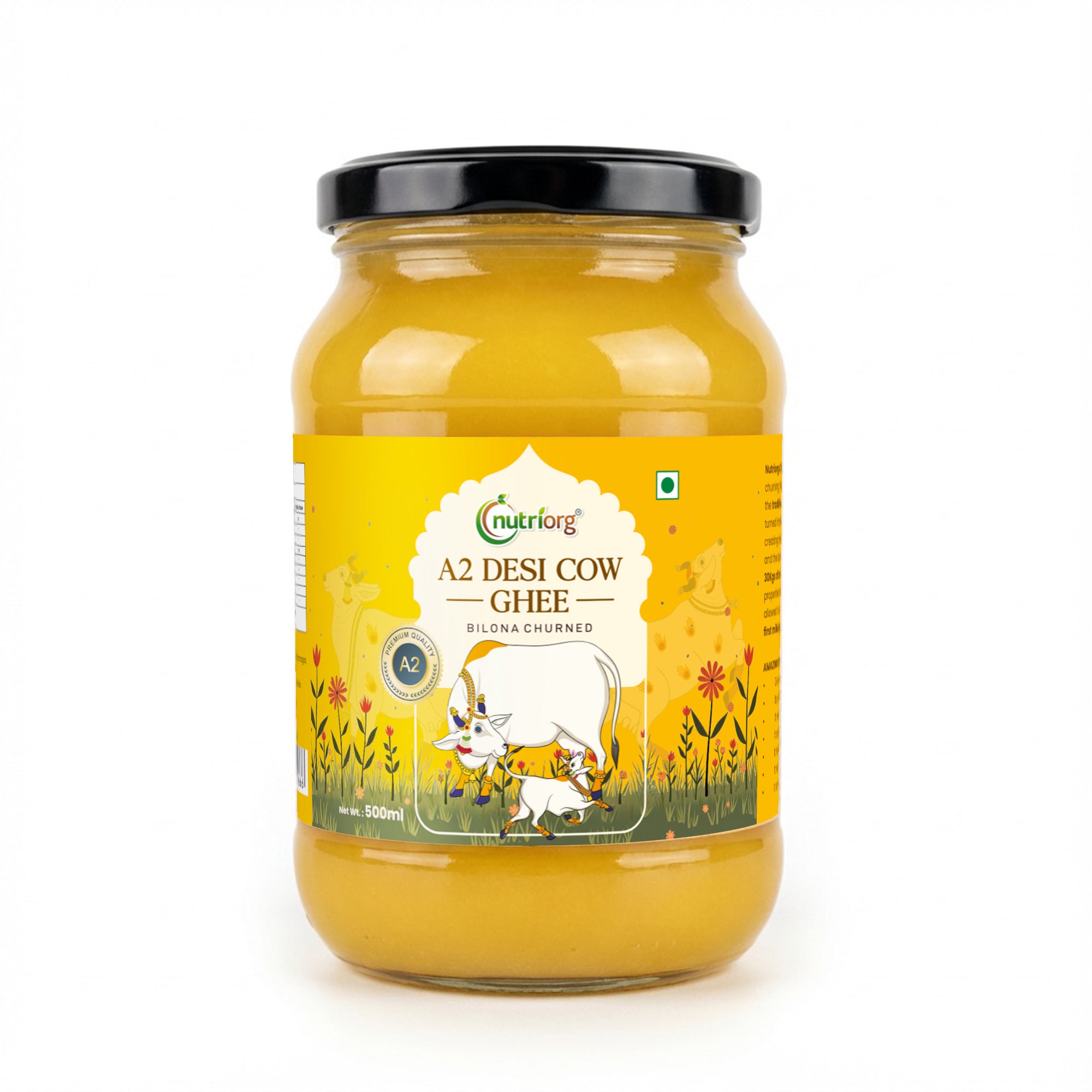 The Nutriorg Certified Organic Cow Ghee is derived from the milk of cows who are fed an organic diet. Our Organic Cow Ghee is made from the milk of stress free cows who are not only fed well but are also allowed to roam freely and feed their calves first. The cows are not exposed to harmful chemical pesticides, artificial hormones that is a common practice in commercial dairies. The quality of the milk changes when cows are stressed, as the hormones that go into the milk change dramatically. Thus we treat our cows with utmost love & care. Nutriorg Certified Organic Cow Ghee is heat stable & perfect to use for cooking at high temperatures. Most other cooking oils, especially refined oils form harmful free radicals at high temperatures. Organic Ghee is rich in many fat soluble nutrients that are essential for the maintenance of good health. Organic ghee benefits are holistic and wholesome. Organic grass-fed cow ghee is one of the most revered new age pantry superhero. Chefs prefer organic ghee as the perfect health-friendly cooking medium against high-temperature cooking oils due to its high smoke point.