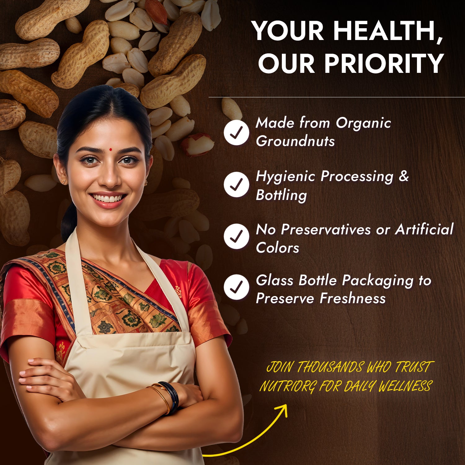 Groundnut or peanut oil is a good all purpose oil for cooking as it has good polyunsaturated and monounsaturated fat (MUFA & PUFA) and is low in saturated fats therefore it is believed to lower chances of atherosclerosis (stroke or a heart attack). The oil is high in energy and has high burning and smoking point. Nutriorg brings to you certified organic groundnut oil which is hygienically extracted from organically grown peanuts. It has added advantage for your health since it is multi-faceted oil and is organically grown. The groundnut oil contains unsaturated fats, replacing saturated and Trans fats with unsaturated fats can reduce the risk of heart diseases by lowering bad cholesterol levels. Groundnut oil is a natural source of phytochemicals, antioxidants that protect the body from damage due to toxins and free radicals. Groundnut oil is a natural source of phytochemicals, antioxidants that protect your body from damage from toxins and free radicals. Peanut oil is rich in phytosterols beta-sitosterol.