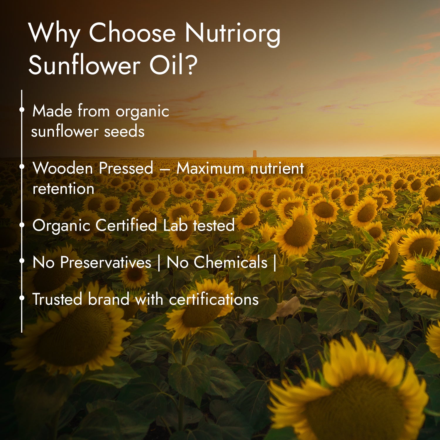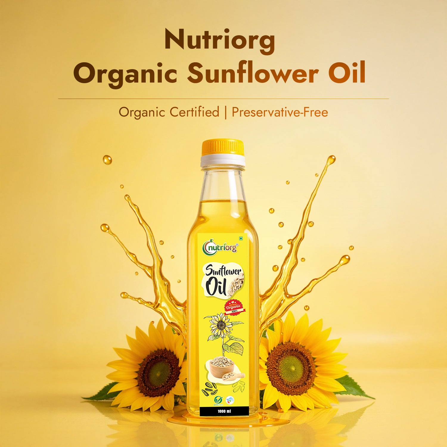 Nutriorg brings certified sunflower oil that is hygienically extracted from organically grown and cultivated sunflower. It has added advantages for your health since it is multi-faceted oil and is organically grown. Sunflower oil is considered an all-purpose cooking oil. Sunflower oil is a light, vegetable-based oil that's high in vitamin E and can be used as a moisturizer. It's also great for cooking since it doesn't burn easily and has a mild flavor. It's also rich in omega-6 fatty acids, which can help you maintain a healthy weight and reduce inflammation in the body.