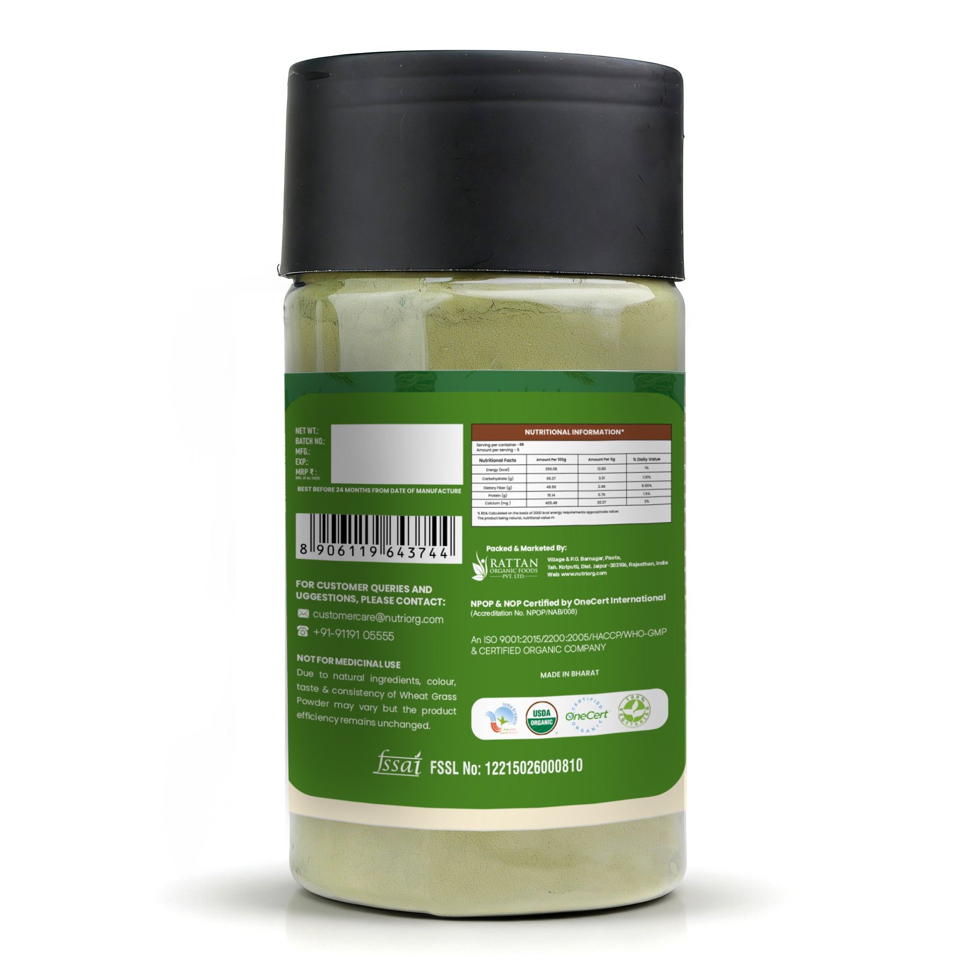Nutriorg certified organic wheat grass powder is made from certified organic wheat grass cultivated in certified organic farmland. Nutriorg Wheat Grass Powder is a certified organic powder. The primary reason for the numerous health benefits of the Nutriorg certified organic Wheat Grass Powder is its concentrated Chlorophyll content (about 70%) in addition to the 98 earth elements it contains including Calcium, Iron, Phosphorus, Magnesium and Potassium. It is also rich in essential enzymes. The best trait being that unlike wheat, wheat grass powder is gluten free. Nutriorg Certified Organic Wheat Grass Powder contains all the properties of the Wheat Grass plant including nutrients, Vitamins and minerals in a perfect balance. Nutriorg Certified Organic Wheatgrass Powder can be mixed in water to make a nutritional drink and can even be added to juices and smoothies