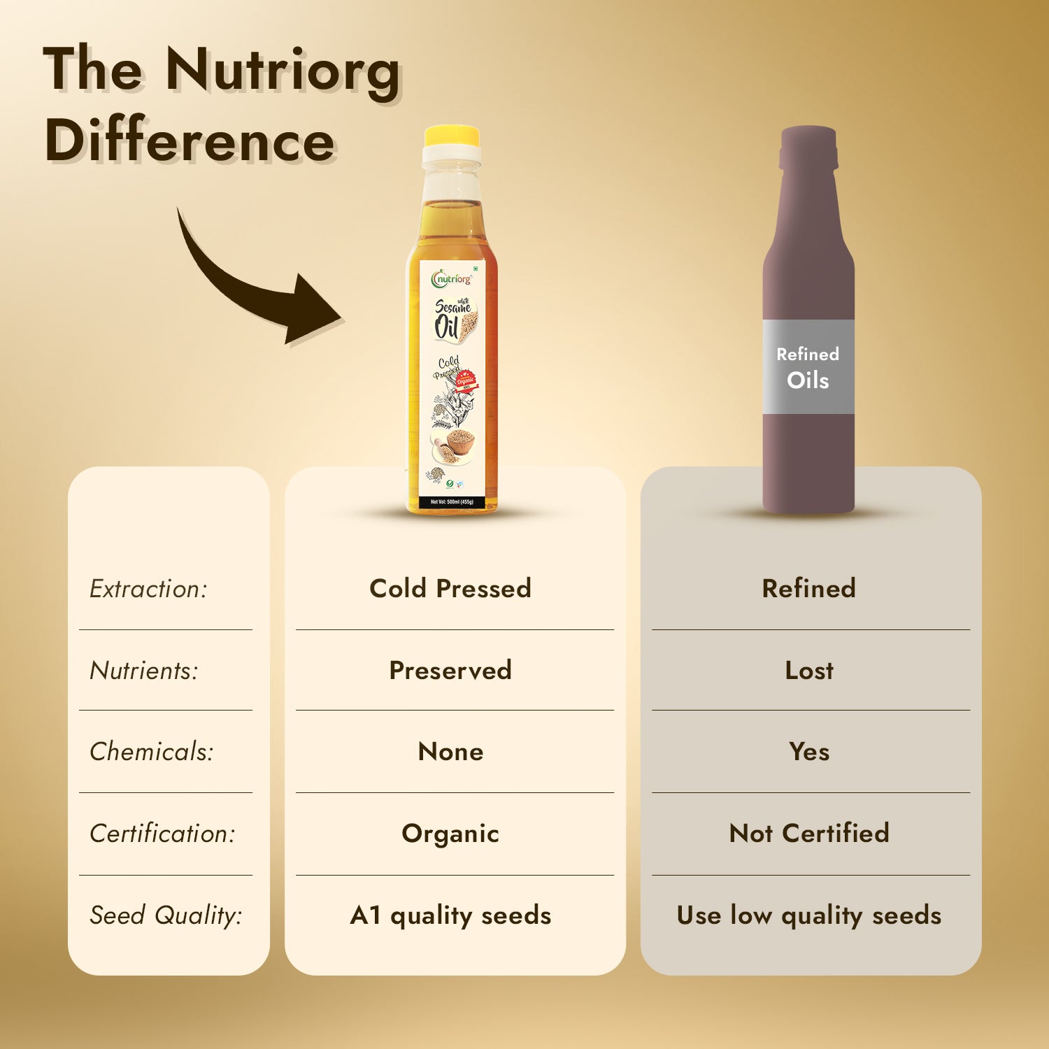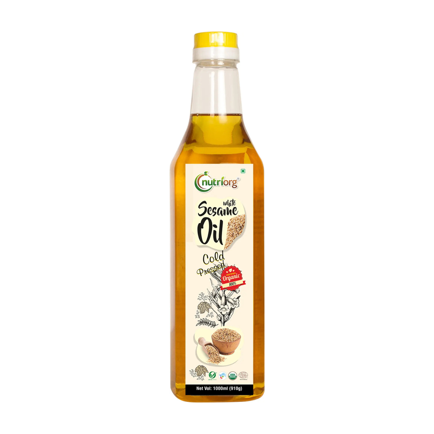 White Sesame oil is known as the 'Queen of oils' for its healing properties as mentioned in the Vedas. Nutriorg manufactures certified sesame oil which is extracted from organically produced sesame seeds. It is one of the healthier options compared to normal vegetable oil. The sesame seeds are primarily grown in African and Indian subcontinent. It is relatively popular as it is cheaper to extract the oil. It is also used in Asian, Japanese, Chinese and Middle Eastern cuisines due to its multiple benefits. Sesame oil contains sesamol and sesaminol, two antioxidants that may have powerful effects on your health. Antioxidants are substances that help reduce cell damage caused by free radicals. Sesame oil is well known for its anti-inflammatory properties. It is great for taking care of joint inflammation, toothaches, and scrapes. Sesame oil comprises 82% unsaturated fatty acids. The sesame oil has a good amount of Vitamins, minerals, compounds and other crucial ingredients which make it a healthier choice.