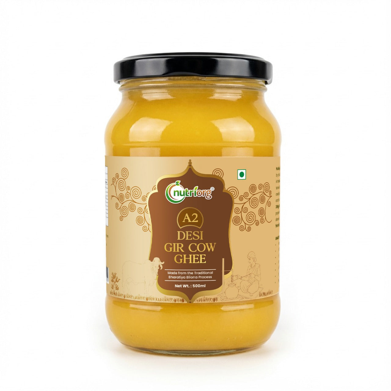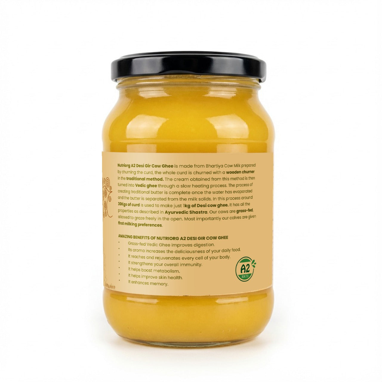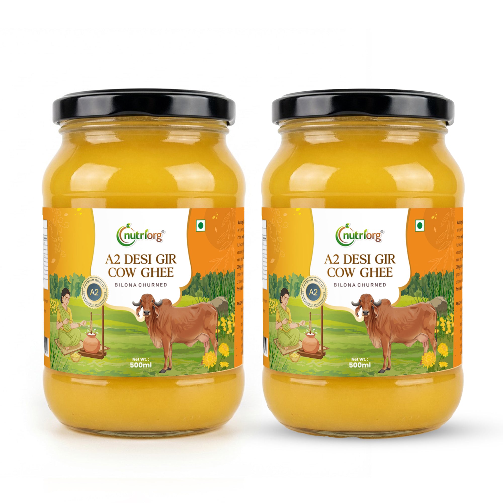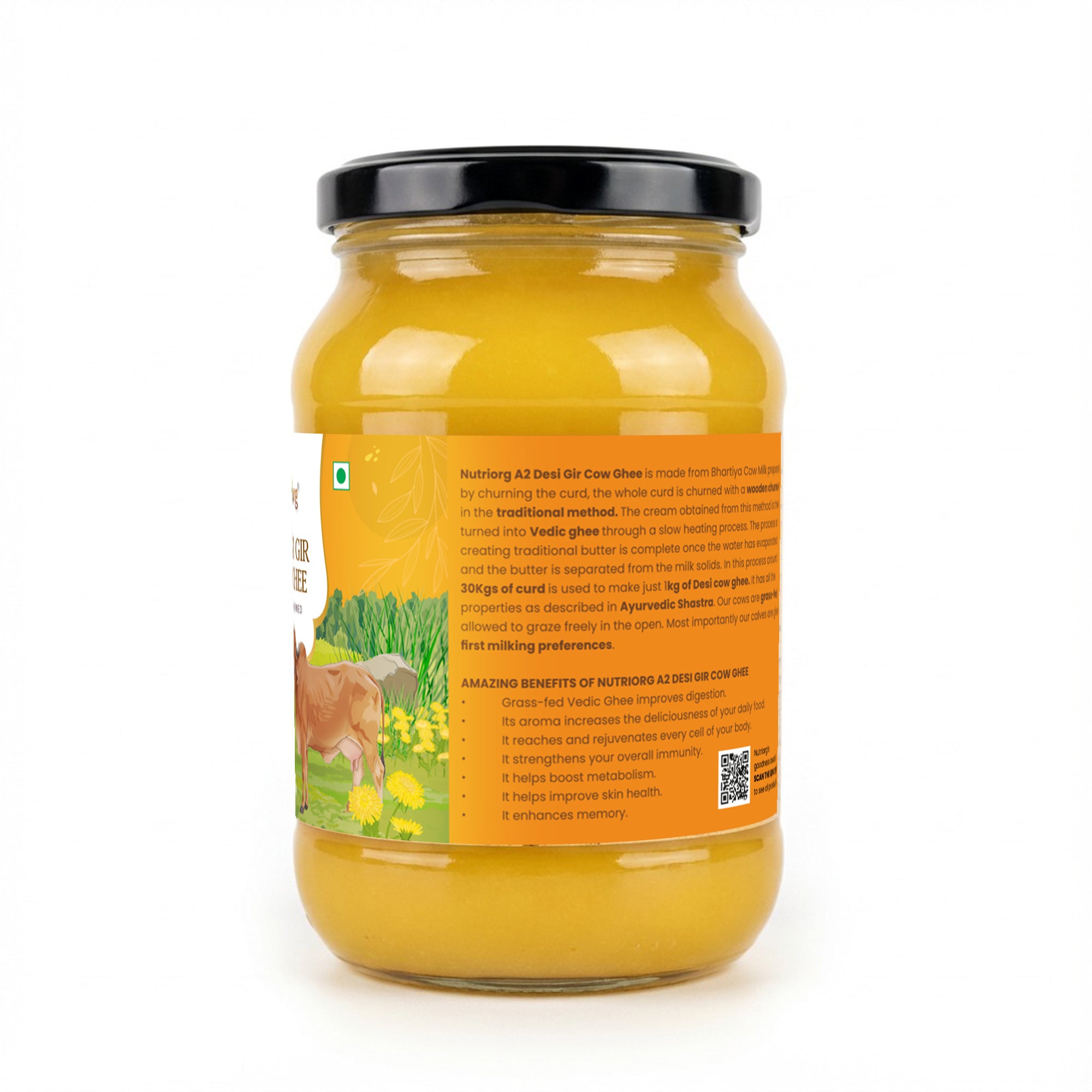 Nutriorg Pure Desi Gir Cow Ghee is made from desi cow milk that comes directly from our own grass-fed cows. Their calves are given first milking preferences, and the milk gathered afterward is boiled to make curds—which then go into making your favorite gourmet foods! The whole curd is churned using a wooden churner, resulting in butter, then heated slowly to create Vedic ghee. To make traditional ghee, butter is separated from the milk solids once all of the water has evaporated. The Nutriorg Desi Gir Cow Ghee is hugely beneficial for the entire body. Consumption of ghee offers a wide range of benefits, including clarity of mind and improves immunity. Because of its high smoke point (250C or 482F), ghee is one of the best to use in cooking since it doesn’t break down into free radicals like others It aids weight loss as the type of saturated fat that Desi Gir Cow Ghee has is a short-chain fatty acid. This helps to burn the stubborn fat in the body while regulating your metabolism. The Gir Cow Ghee balances your hormones. The fat content in the body is mostly saturated fat and only 3% is of other types. This ratio is absolutely important to know for good health and well-being. The Nutriorg Desi Gir Cow Ghee is rich in Vitamin K2 which builds hormones along with Vitamin A, D, E & K. 3. It is proven to be good for the heart. Vitamin K2 found in Desi Gir Cow Ghee helps in preventing calcium deposits in the arteries that can lead to blockages and obstruction of blood flow. It lowers bad cholesterol levels and increases good cholesterol levels, thus maintaining a healthy balance.