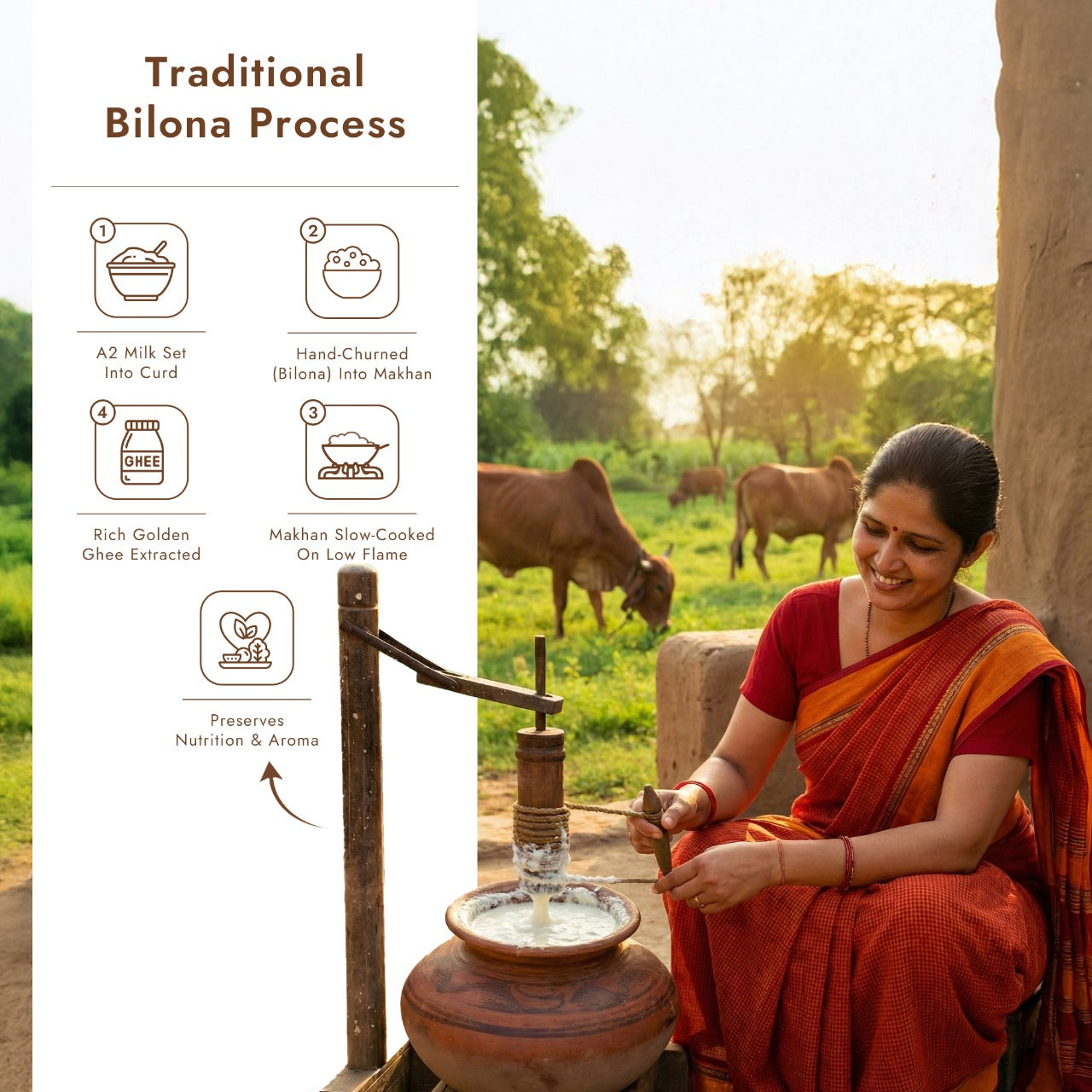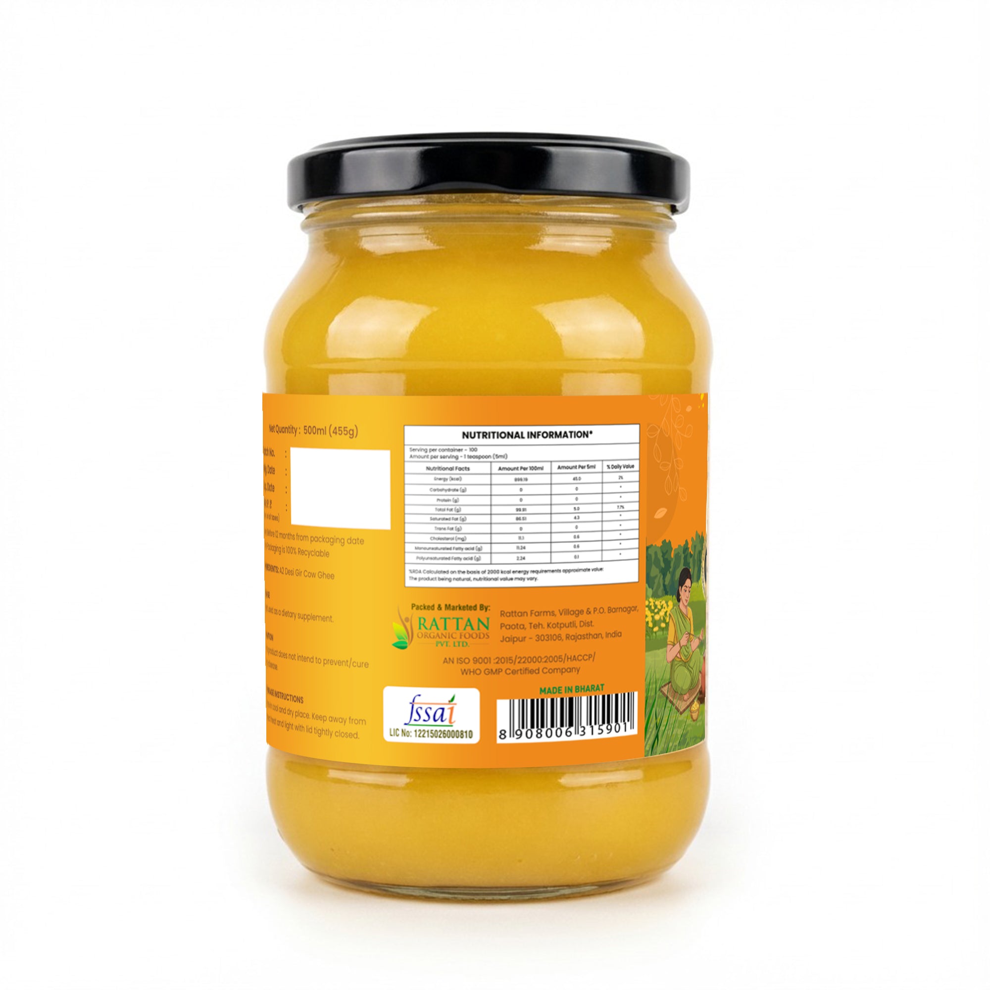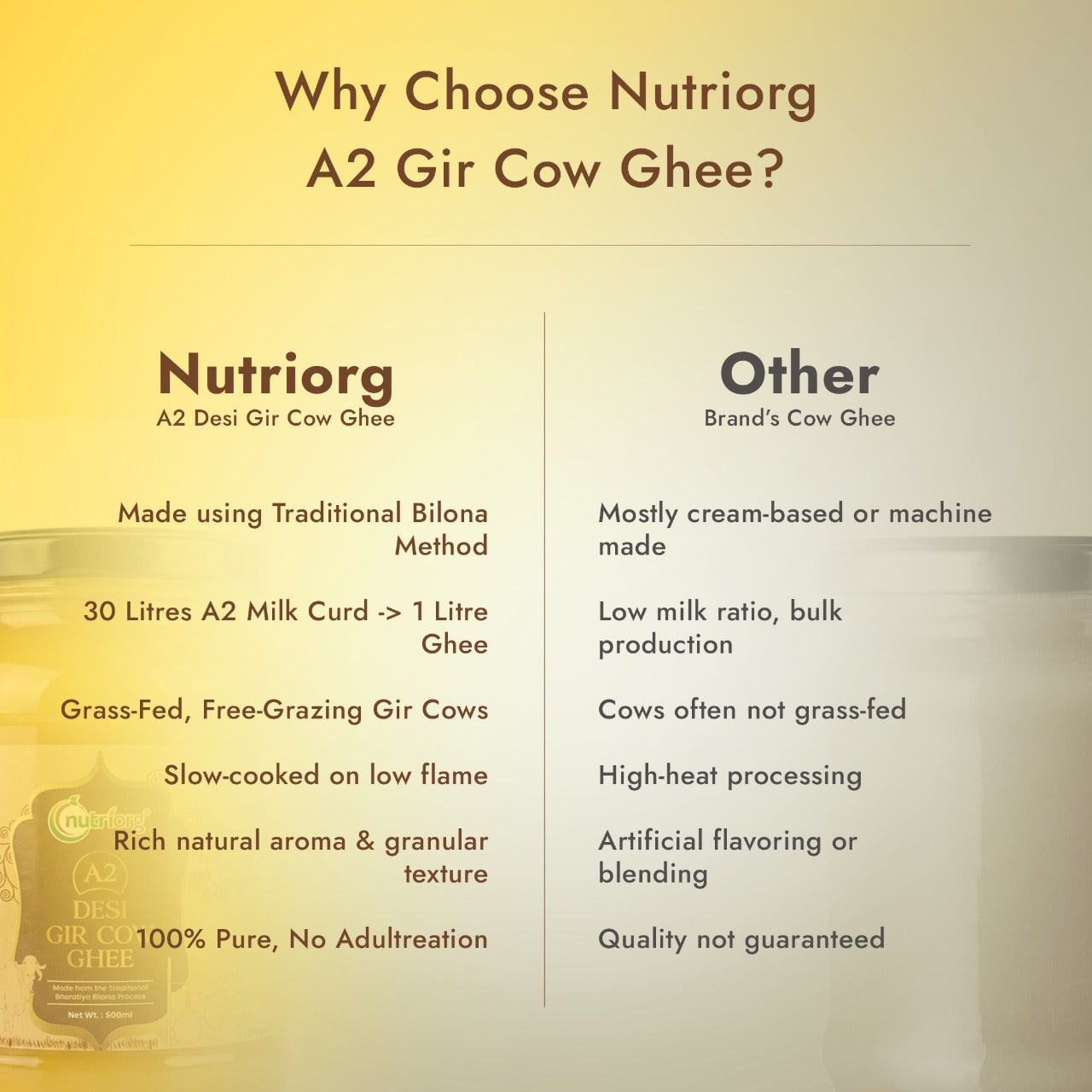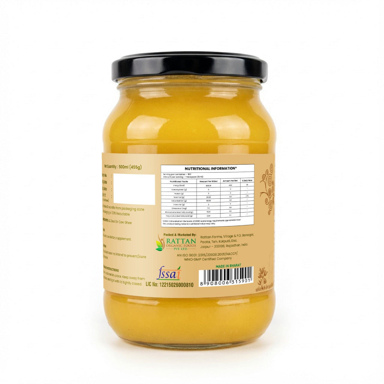 Nutriorg Pure Desi Gir Cow Ghee is made from desi cow milk that comes directly from our own grass-fed cows. Their calves are given first milking preferences, and the milk gathered afterward is boiled to make curds—which then go into making your favorite gourmet foods! The whole curd is churned using a wooden churner, resulting in butter, then heated slowly to create Vedic ghee. To make traditional ghee, butter is separated from the milk solids once all of the water has evaporated. The Nutriorg Desi Gir Cow Ghee is hugely beneficial for the entire body. Consumption of ghee offers a wide range of benefits, including clarity of mind and improves immunity. Because of its high smoke point (250C or 482F), ghee is one of the best to use in cooking since it doesn’t break down into free radicals like others It aids weight loss as the type of saturated fat that Desi Gir Cow Ghee has is a short-chain fatty acid. This helps to burn the stubborn fat in the body while regulating your metabolism. The Gir Cow Ghee balances your hormones. The fat content in the body is mostly saturated fat and only 3% is of other types. This ratio is absolutely important to know for good health and well-being. The Nutriorg Desi Gir Cow Ghee is rich in Vitamin K2 which builds hormones along with Vitamin A, D, E & K. 3. It is proven to be good for the heart. Vitamin K2 found in Desi Gir Cow Ghee helps in preventing calcium deposits in the arteries that can lead to blockages and obstruction of blood flow. It lowers bad cholesterol levels and increases good cholesterol levels, thus maintaining a healthy balance.