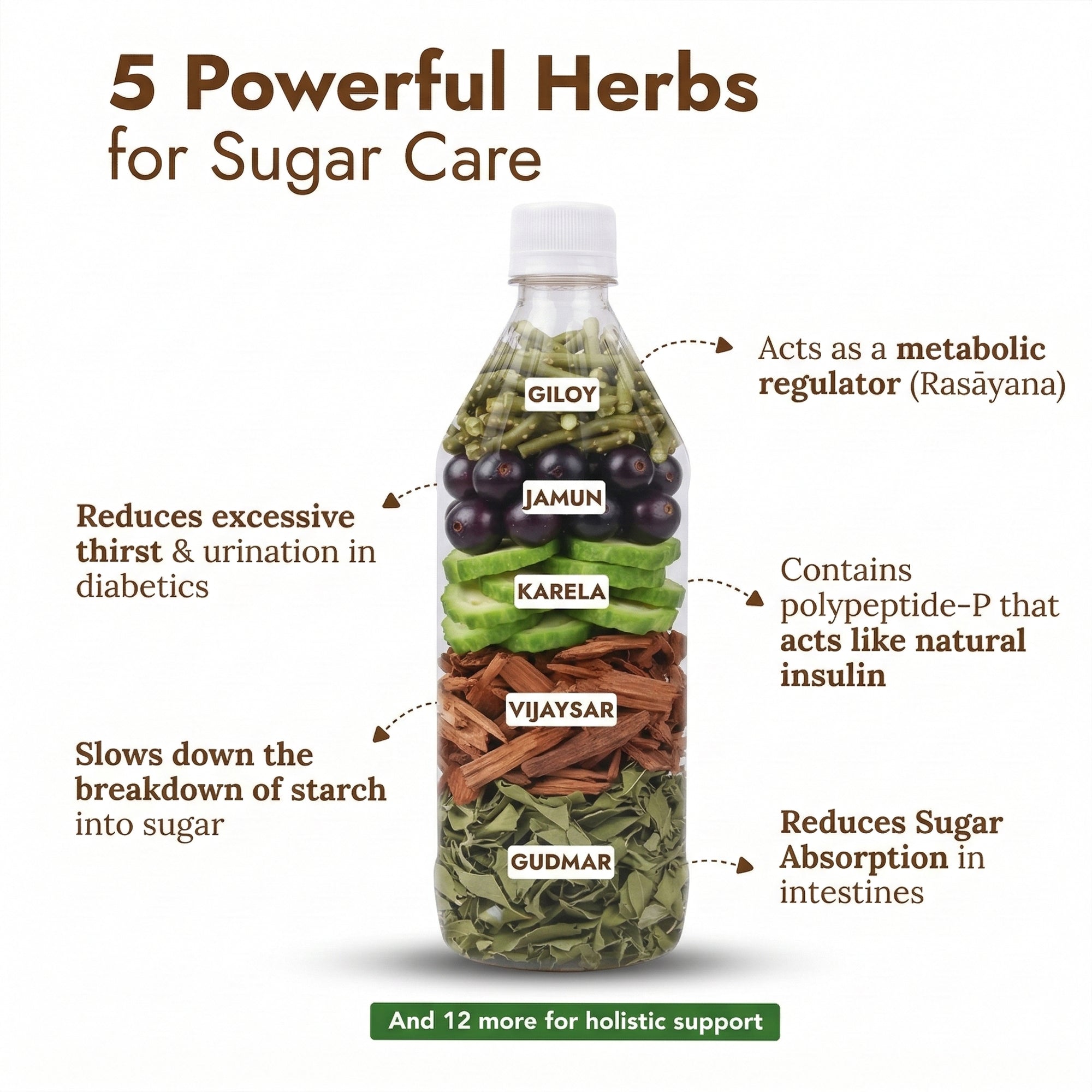 A Science-Backed Ayurvedic blend of 18 herbs, including Gurmar, Methi, Amla, Jamun, Vijaysar, Cinnamon, Turmeric, Green tea extract, Giloy, Triphala, Arjun, Ashwagandha, Shatavari, Fennel seeds, Aloe Vera, Neem, and Tulsi