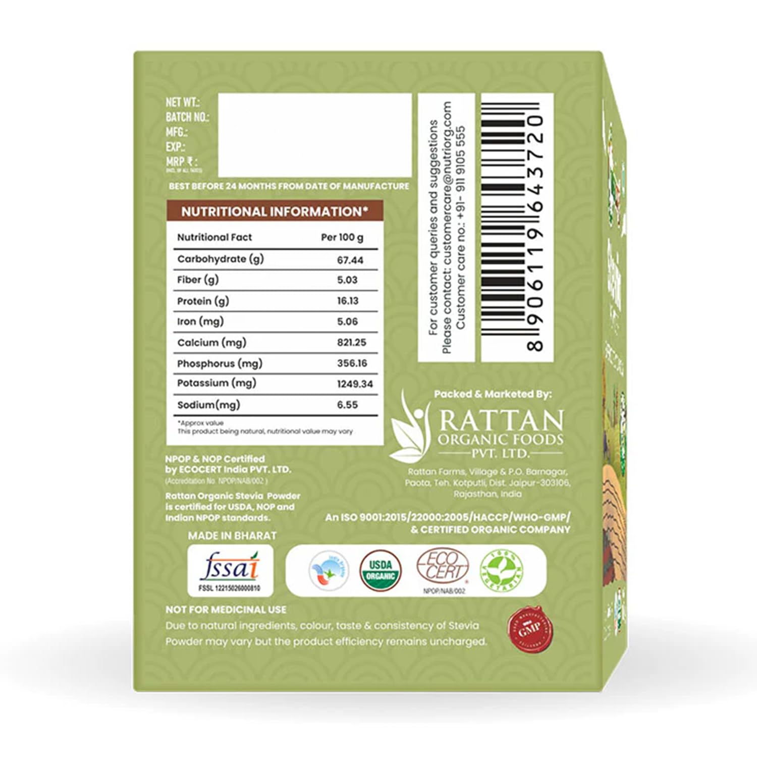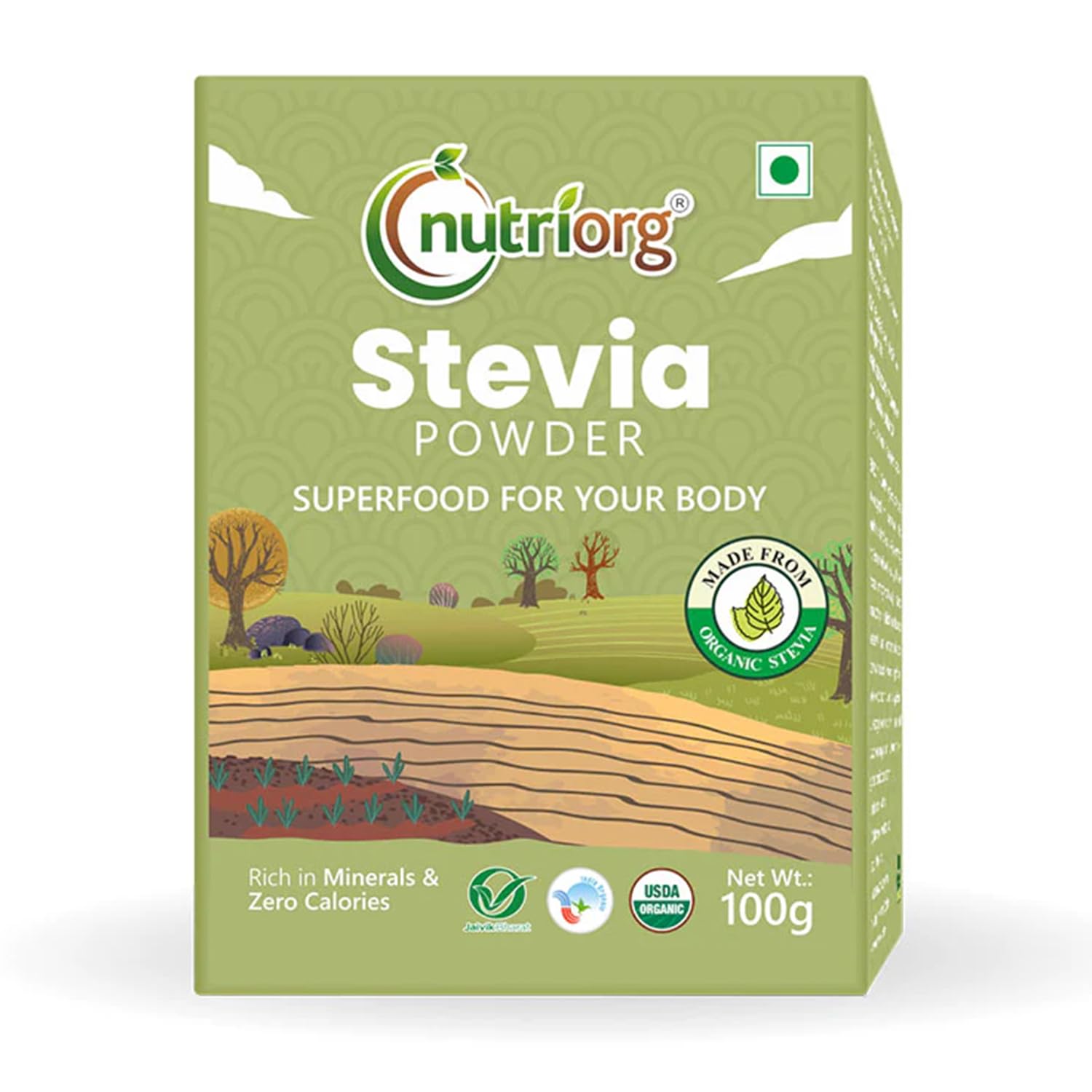 Nutriorg Stevia Leaf Powder is completely organically grown in company-owned certified organic farms located in different parts of Rajasthan. Stevia herb is extremely low in calories. Its dry leaves possess roughly 50 times more sweetness than sugar. Along with being an herb Stevia contains many vital minerals, vitamins that are significantly absent in artificial sweeteners.