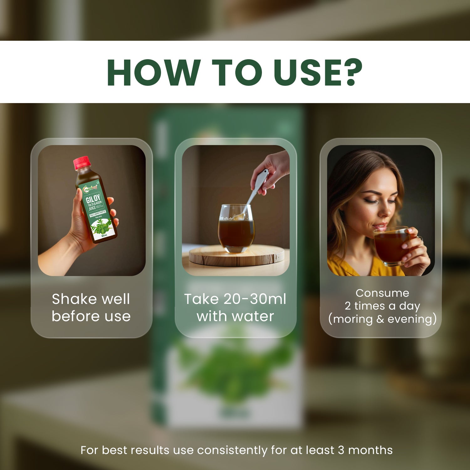 How to Use: Mix 15-30 ml of Nutriorg Giloy Tulsi Neem Juice in 200 ml of lukewarm water in a non-metallic glass. Consume this refreshing blend on an empty stomach twice a day, preferably in the morning and evening, for optimal results. For best outcomes, use regularly for six months.