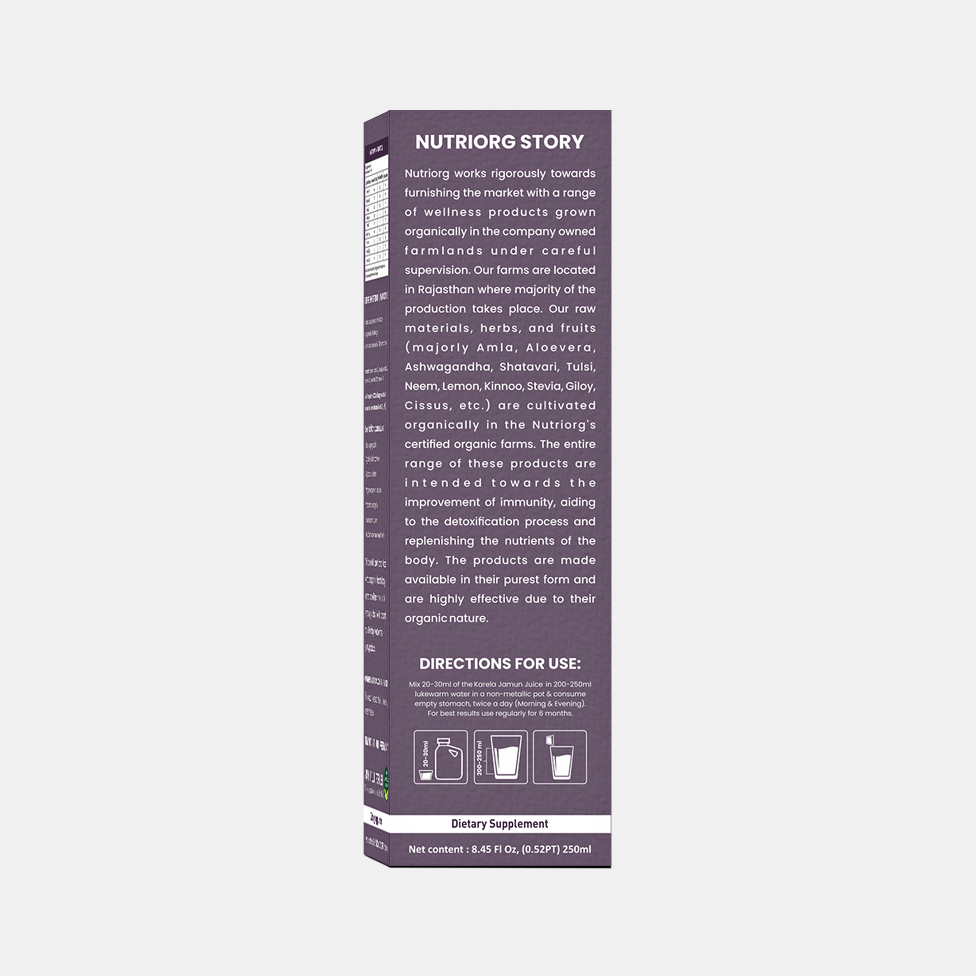 Mix 20-30 ml of Nutriorg Karela Jamun Juice in 200 ml of lukewarm water in a non-metallic pot. Consume this revitalizing blend on an empty stomach, preferably in the morning and evening, to maximize its health benefits.