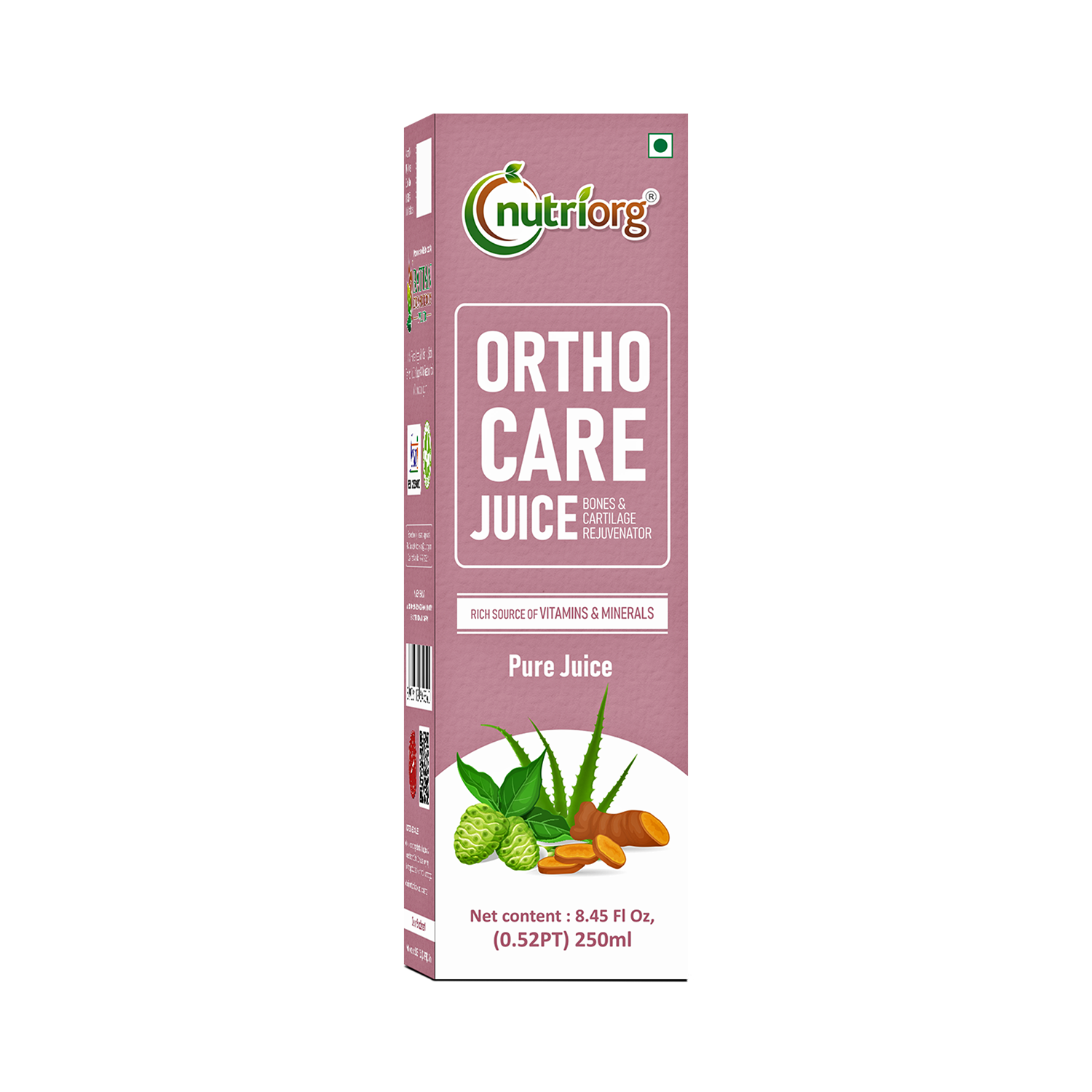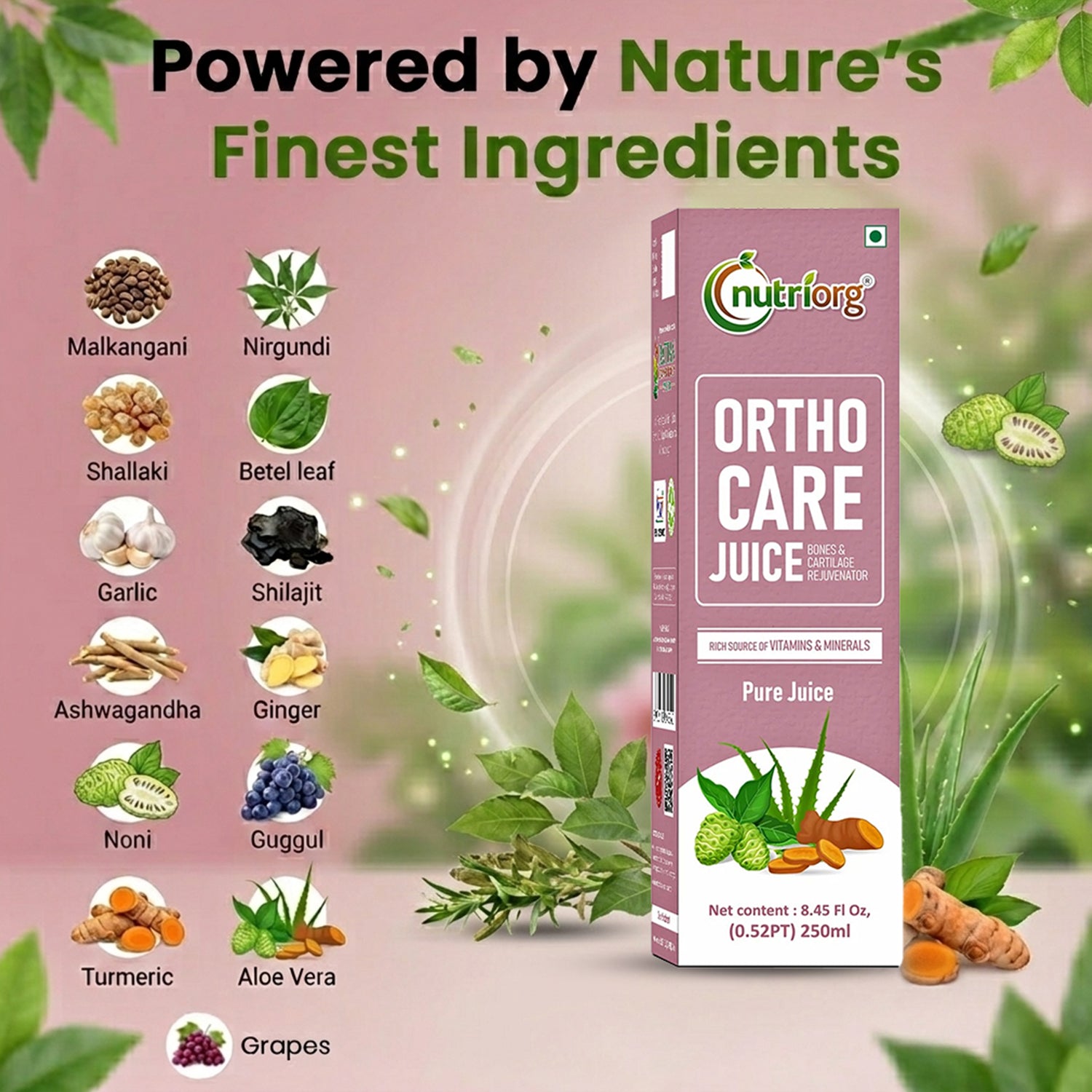Nutriorg Ortho Care Juice is a potent blend of 100% pure, undiluted, and unadulterated ayurvedic herbs, meticulously cultivated in our certified organic farmlands. This unique formulation includes Salai Guggal, Nirgundi, Rasna, Ginger, Lasuna, Ashwagandha, Betel leaf, and Turmeric Juice. These herbs work synergistically to restore joint lubrication, enhance flexibility, and alleviate joint pain.