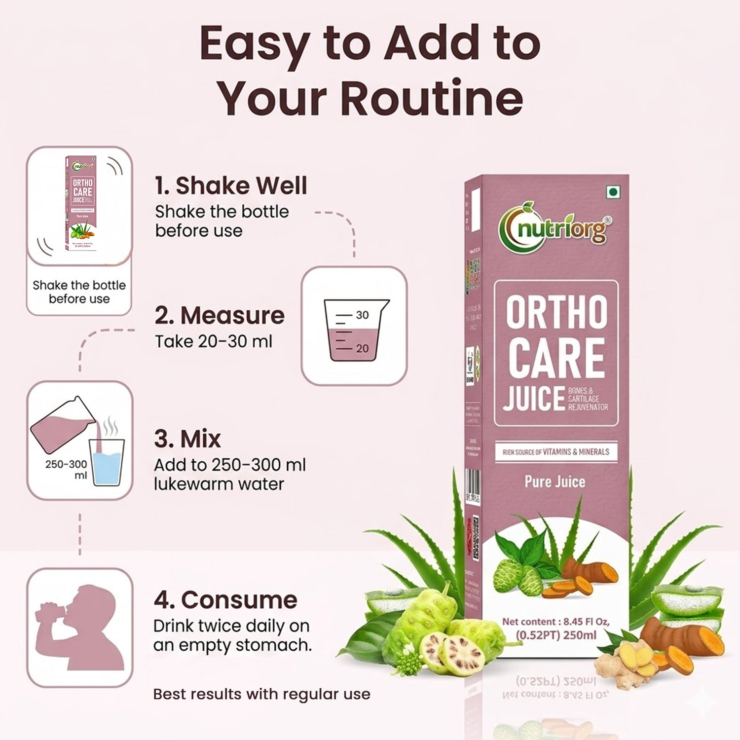 How to Use: Mix 15-20 ml of Nutriorg Ortho Care Juice in 200 ml of lukewarm water in a non-metallic pot. Consume this herbal tonic on an empty stomach twice a day, preferably in the morning and evening, to experience its full benefits.