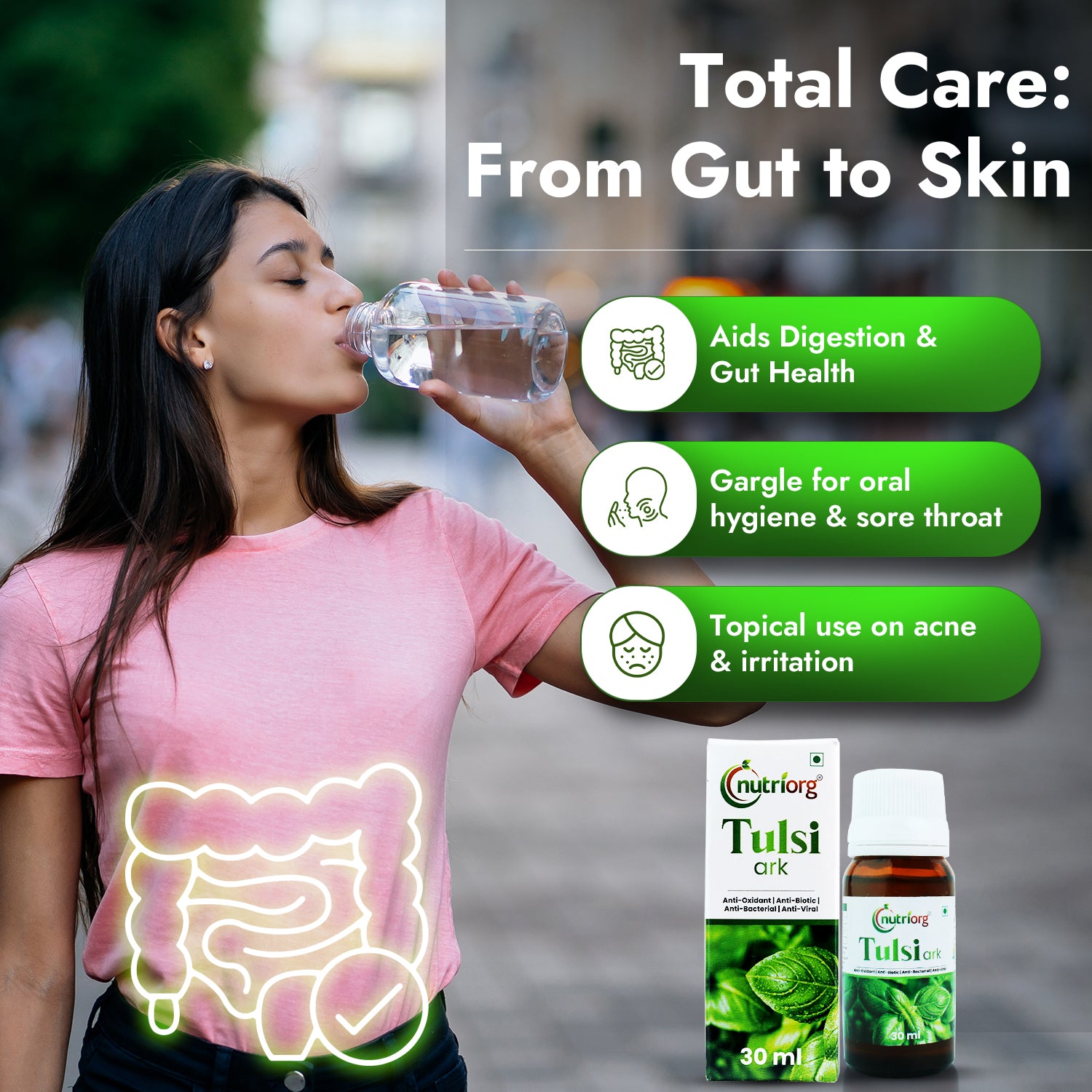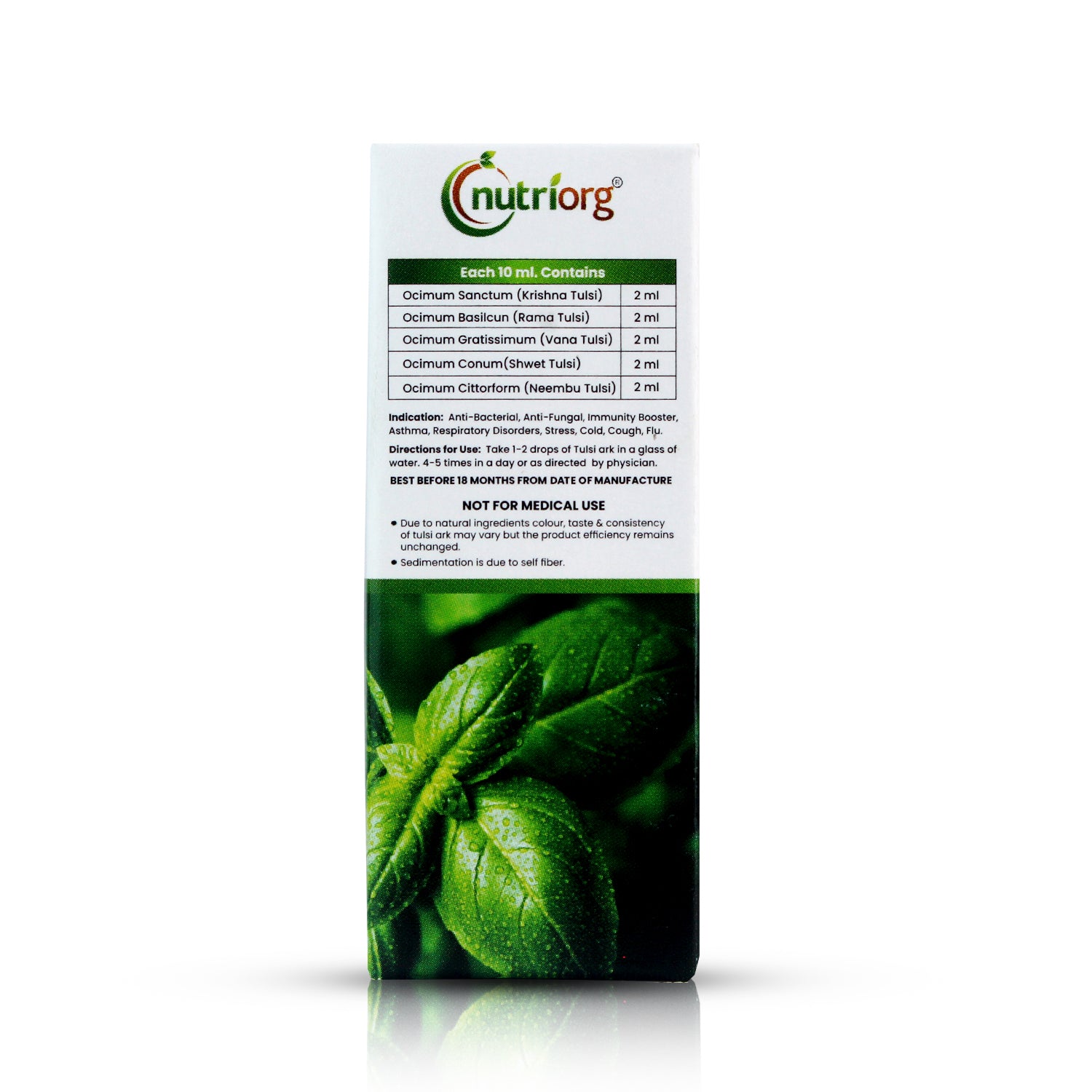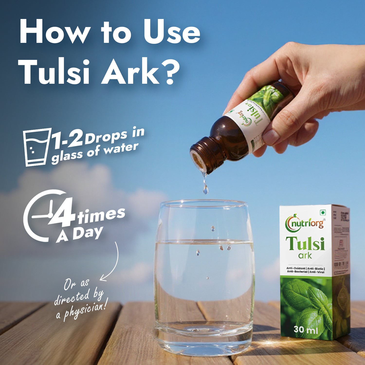 - Drink 1 drop of the Nutriorg Tulsi Ark in one glass (200ml) water.