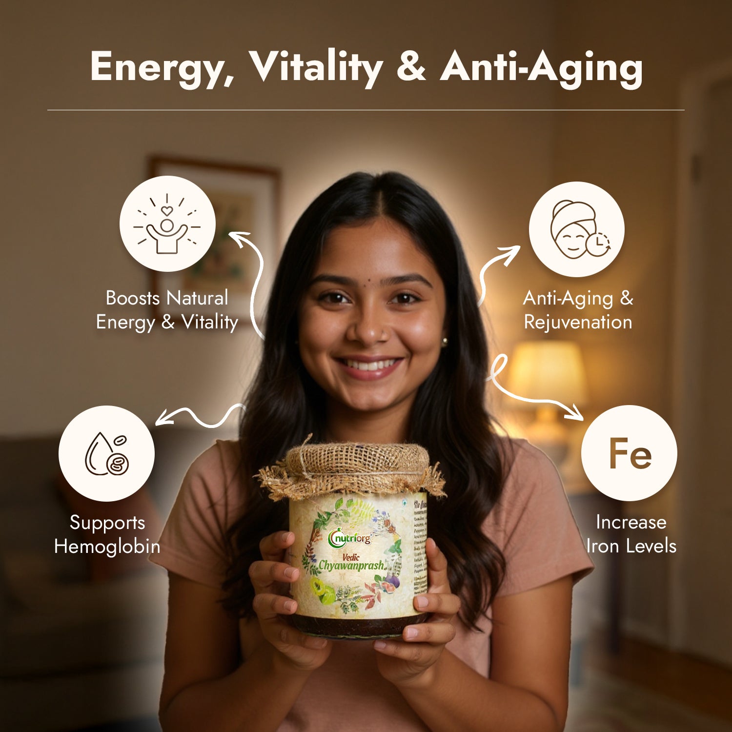 - Nutriorg Vedic Chyawanprash is rejuvenating and energizing, as it is rich in Vitamin C. Chyawanprash supports digestion as well as in the absorption of nutrients and is so abundant in nutritional properties that it is known as “The Elixir of Life.