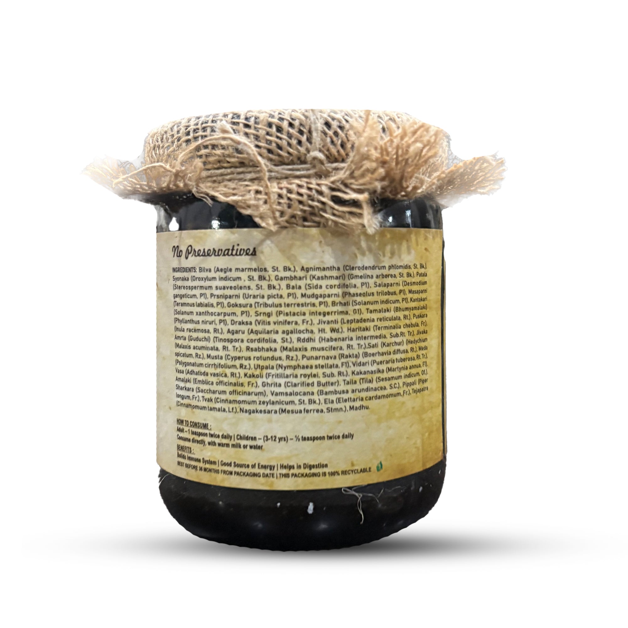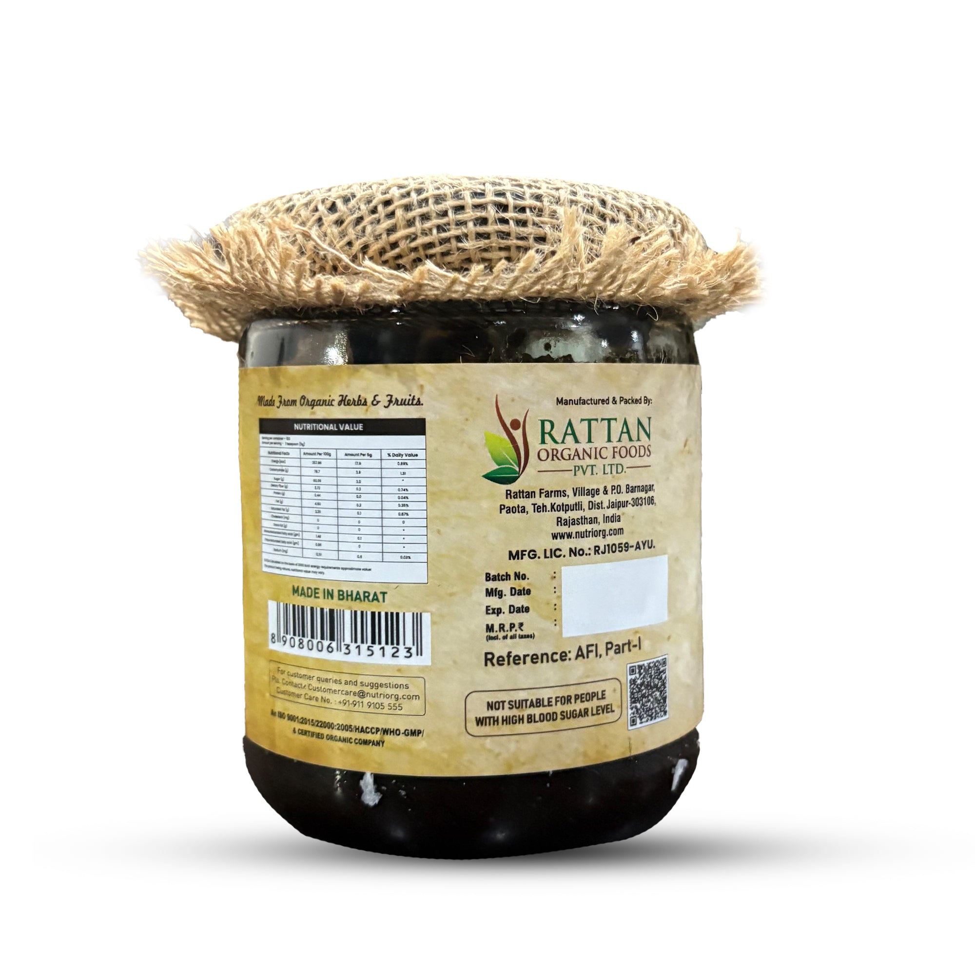 Nutriorg Vedic Chyawanprash is made from organic herbs and fruits. It comprises of : Amla, Patala, Agnimantha, Gambhari, Bilva, Shyonaka, Gokshura, Shalaparni, Brihat, Kantakari, Pippali, Karkatshringi, Draksha, Guduchi, Haritaki, Bala, Tamalaki, Vasa, Jiwanti, Shati Musta, Pushkara, Kakanasika, Mudgaparni, Mashaparni, Vidari, Bulbifera, Meda, Mahameda, Jivaka, Rishabhak, Kshir Kakoli, Ghrita, Vamsha, Tvak, Sukshamaila, Tvakpatra, Nagkesara, Bhrak Bhasma, Mukta Pishti, Akarkarabha, Lavanga, Kumkum, Sesame Oil and Honey. The Nutriorg Vedic Chyawanprash is a combination of 49 herbs and 5 other ingredients. It is less sweet than other such products to increase its nutritional value and be less on calories. It is a 5000 year old Ayurvedic formula in the form of a multi-herbal jam. It is believed to be a “Rasayana” for all the tissues of the Human body. “Rasayana” promotes systemic rejuvenation of the mind and body. Antioxidant-rich spices, botanicals and herbs are combined in a specific amount with ghee, black sesame oil and honey to make a delicious jam that can regularly be consumed to support overall health and vitality."