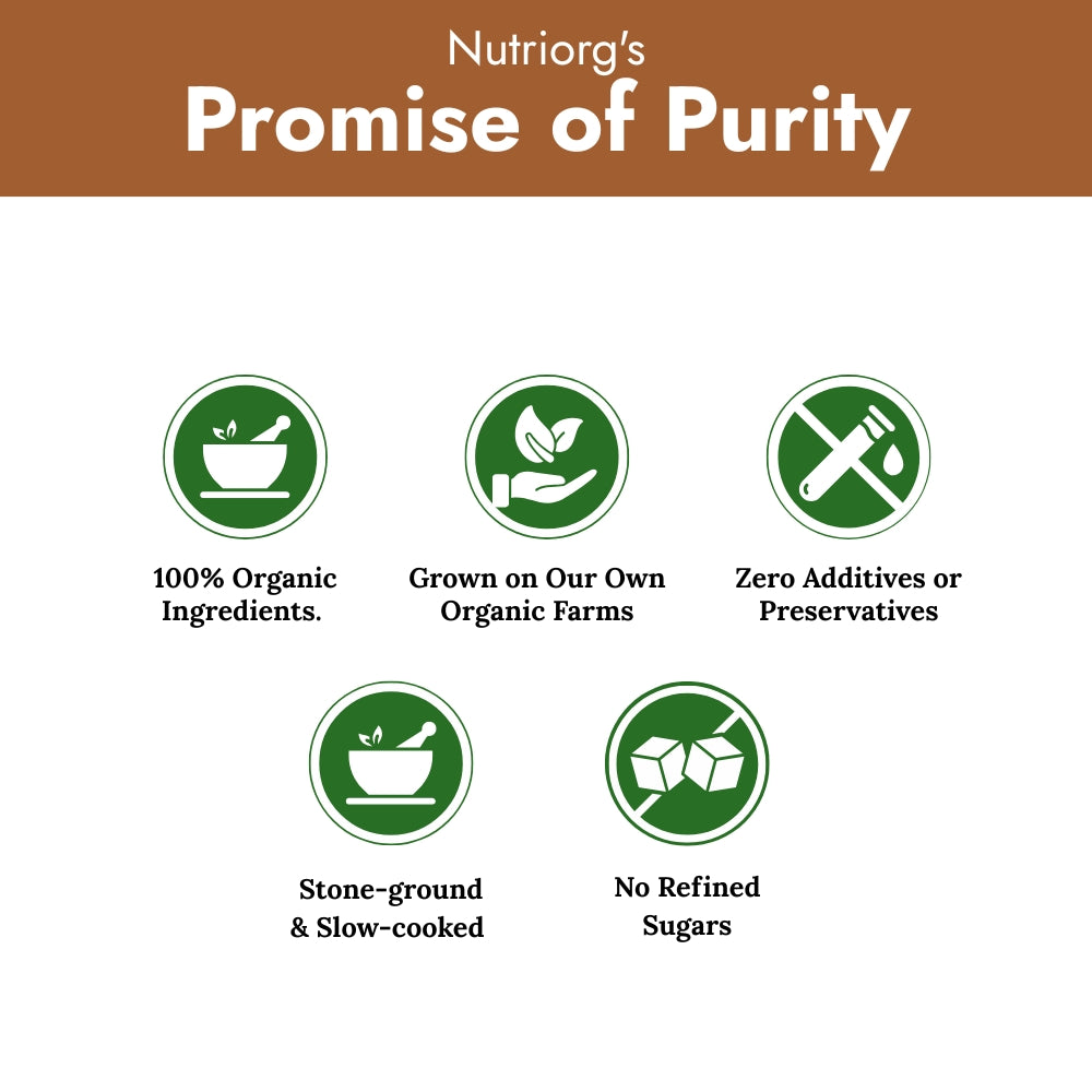 Nutriorg Vedic Chyawanprash is made from organic herbs and fruits. It comprises of : Amla, Patala, Agnimantha, Gambhari, Bilva, Shyonaka, Gokshura, Shalaparni, Brihat, Kantakari, Pippali, Karkatshringi, Draksha, Guduchi, Haritaki, Bala, Tamalaki, Vasa, Jiwanti, Shati Musta, Pushkara, Kakanasika, Mudgaparni, Mashaparni, Vidari, Bulbifera, Meda, Mahameda, Jivaka, Rishabhak, Kshir Kakoli, Ghrita, Vamsha, Tvak, Sukshamaila, Tvakpatra, Nagkesara, Bhrak Bhasma, Mukta Pishti, Akarkarabha, Lavanga, Kumkum, Sesame Oil and Honey. The Nutriorg Vedic Chyawanprash is a combination of 49 herbs and 5 other ingredients. It is less sweet than other such products to increase its nutritional value and be less on calories. It is a 5000 year old Ayurvedic formula in the form of a multi-herbal jam. It is believed to be a “Rasayana” for all the tissues of the Human body. “Rasayana” promotes systemic rejuvenation of the mind and body. Antioxidant-rich spices, botanicals and herbs are combined in a specific amount with ghee, black sesame oil and honey to make a delicious jam that can regularly be consumed to support overall health and vitality."